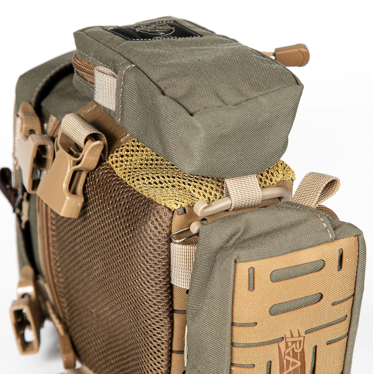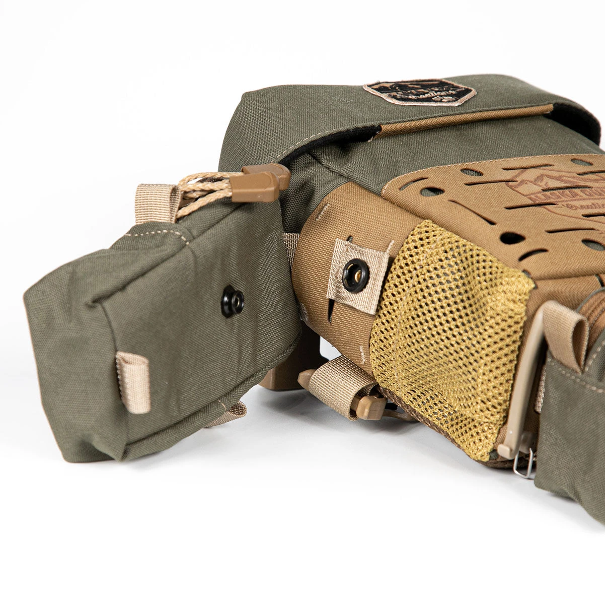The Alaska Guide Creations Ravus Side Pocket is a stand alone zippered pocket that can be attached to any belt, bino harness, backpack, etc. However, it was designed to attach the side of the Ravus Bino Pack. The pocket features dual zippers that make it ideal for right and left handed users. It attaches to the side of the Ravus with one strap affixed with a snap closer and one gatekeeper.