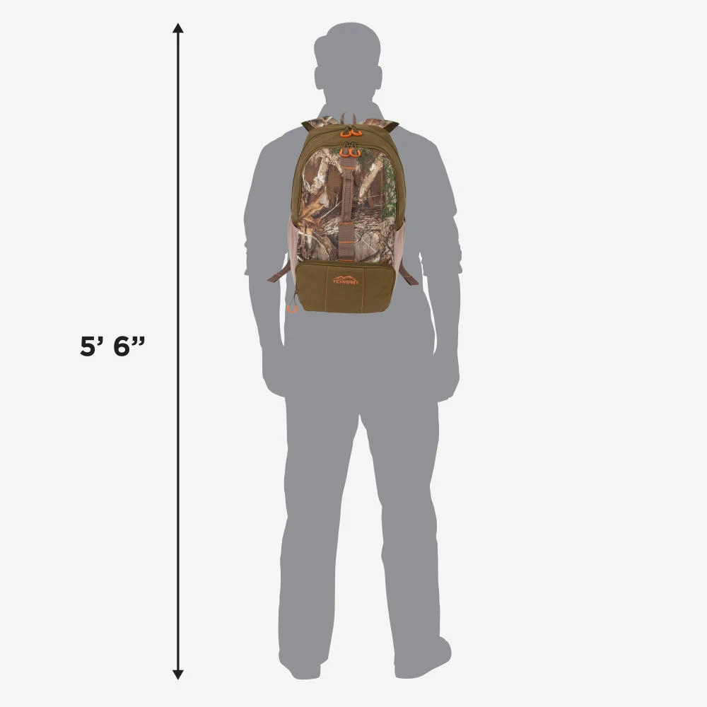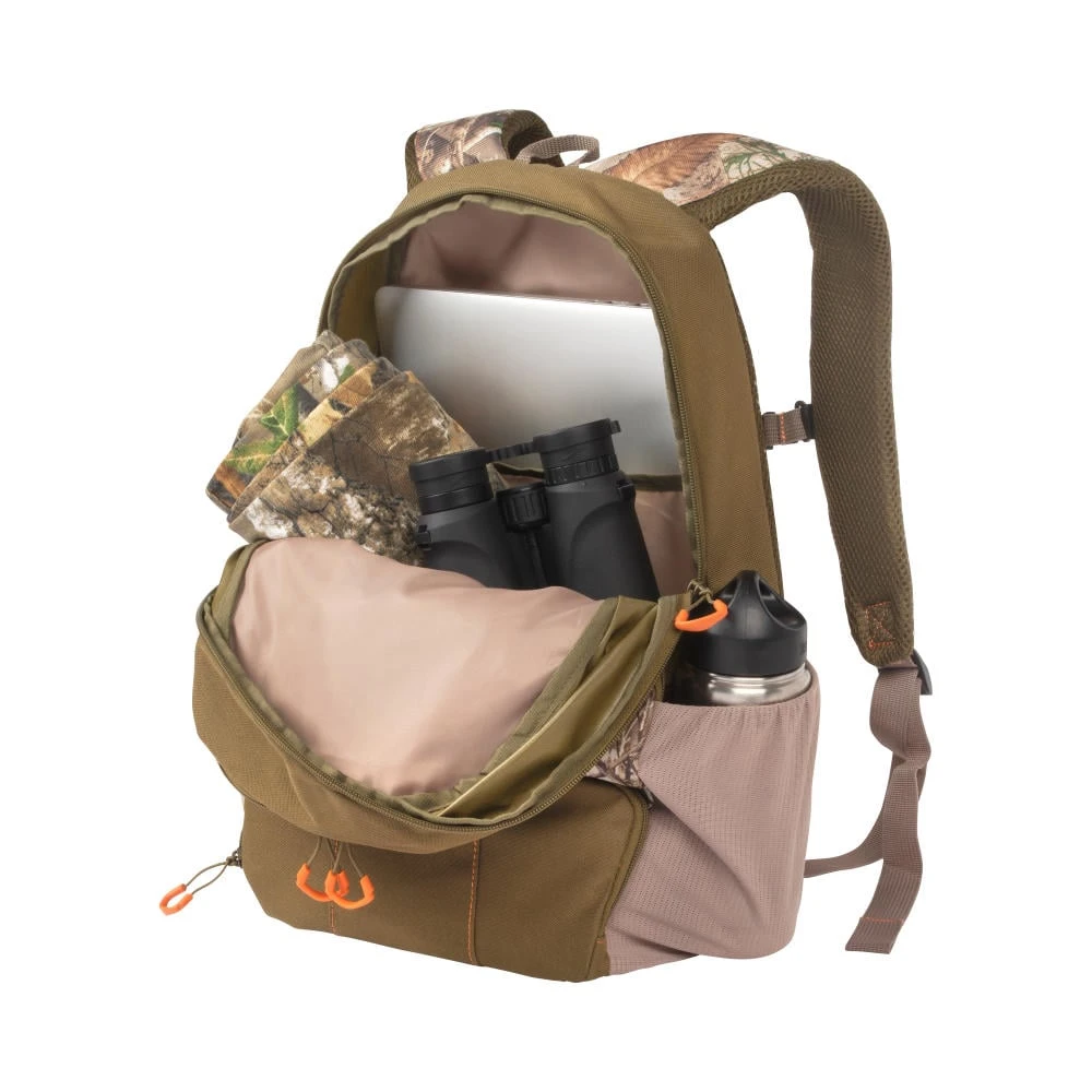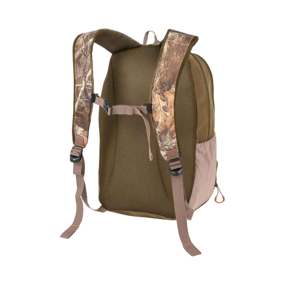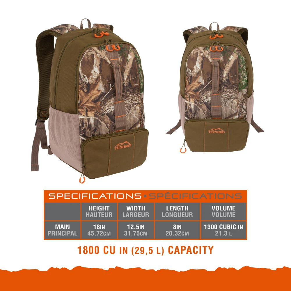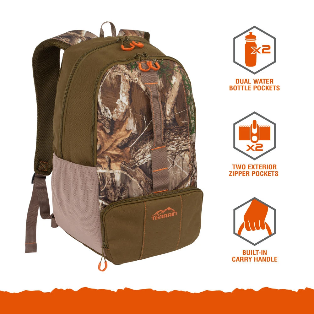 The Terrain™ Dune Daypack features a Realtree Edge® camouflage backpack with large storage and organizer compartments to help manage your gear. An oversized front handle for easier grab-and-go situations while adjustable shoulder straps and sternum strap provide additional security. The padded mesh back offers breathability when in use and a front accessory pocket, dual side stretch mesh pockets, and webbing loops delivers the extra storage needed for your next adventure.