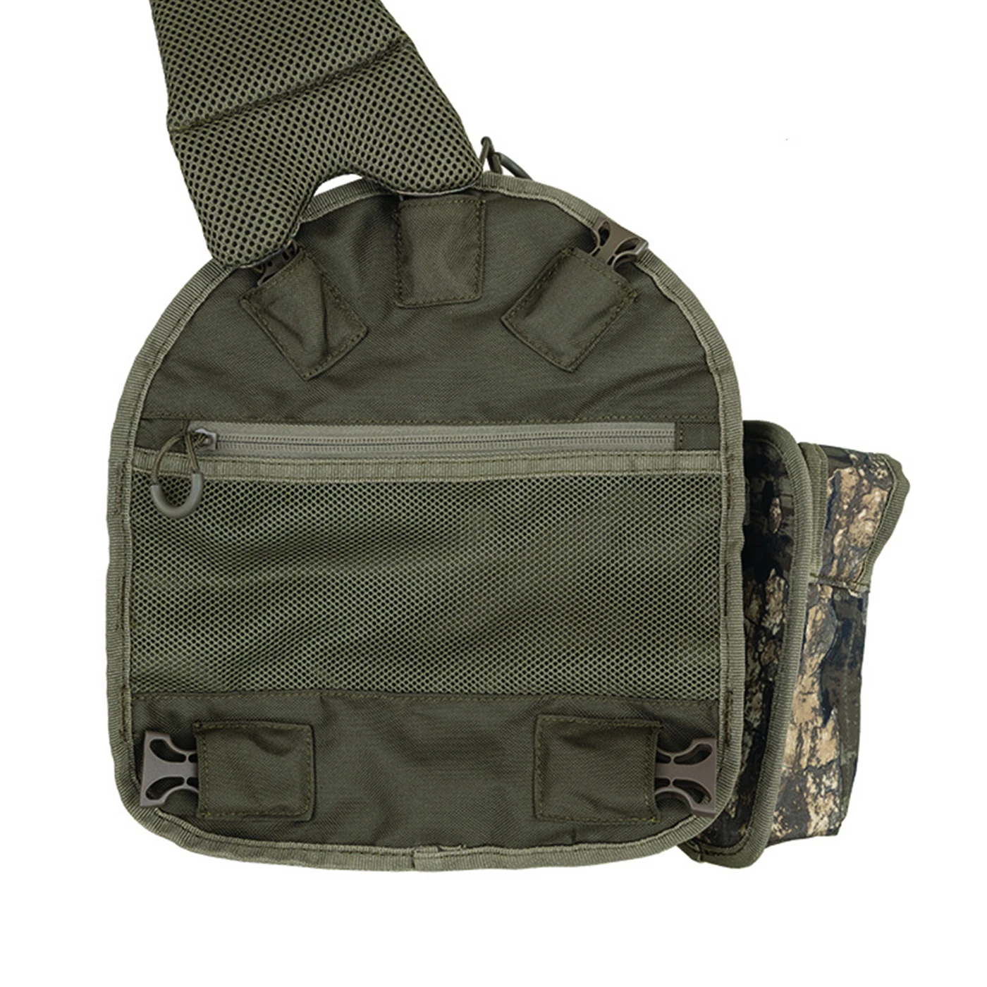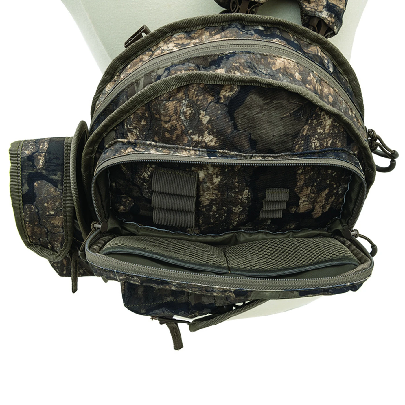 The Realtree Timber Ambush Sling Pack is a lightweight, run nā gun pack that features an ambidextrous shoulder strap. It has MOLLE system on both sides, which allows the ThermaCELLĀ® pocket to attach to either side of the sling. Weighing only one pound with multiple pockets, this sling will carry everything you need for a day of turkey hunting.