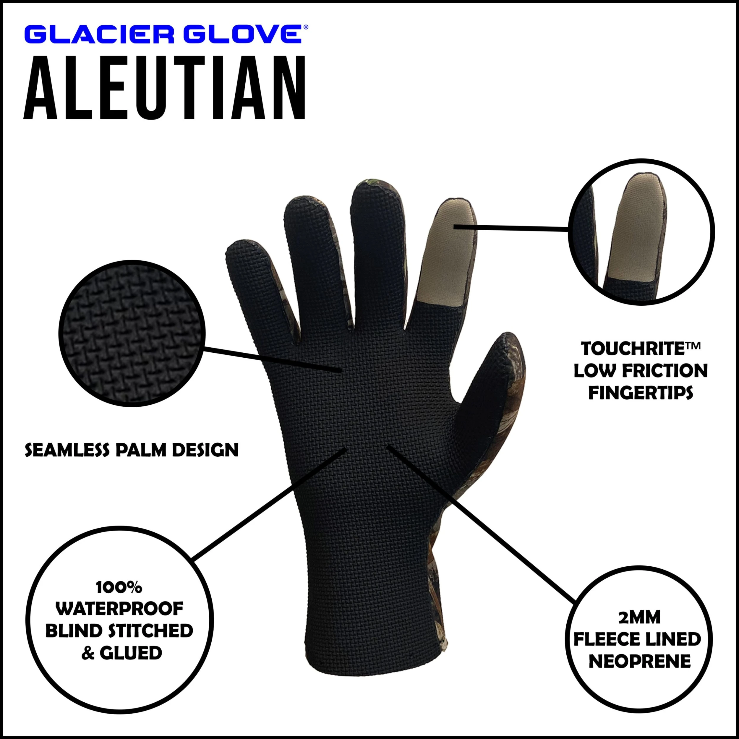 HIGH-PERFORMANCE CONSTRUCTION: The Aleutian is the camo version of our best-selling waterproof glove. Uniquely constructed from high quality neoprene, this fleece-lined glove is 100% waterproof. Featuring a sharkskin palm for a secure grip and touchrite low friction fingertips for enhanced trigger control.